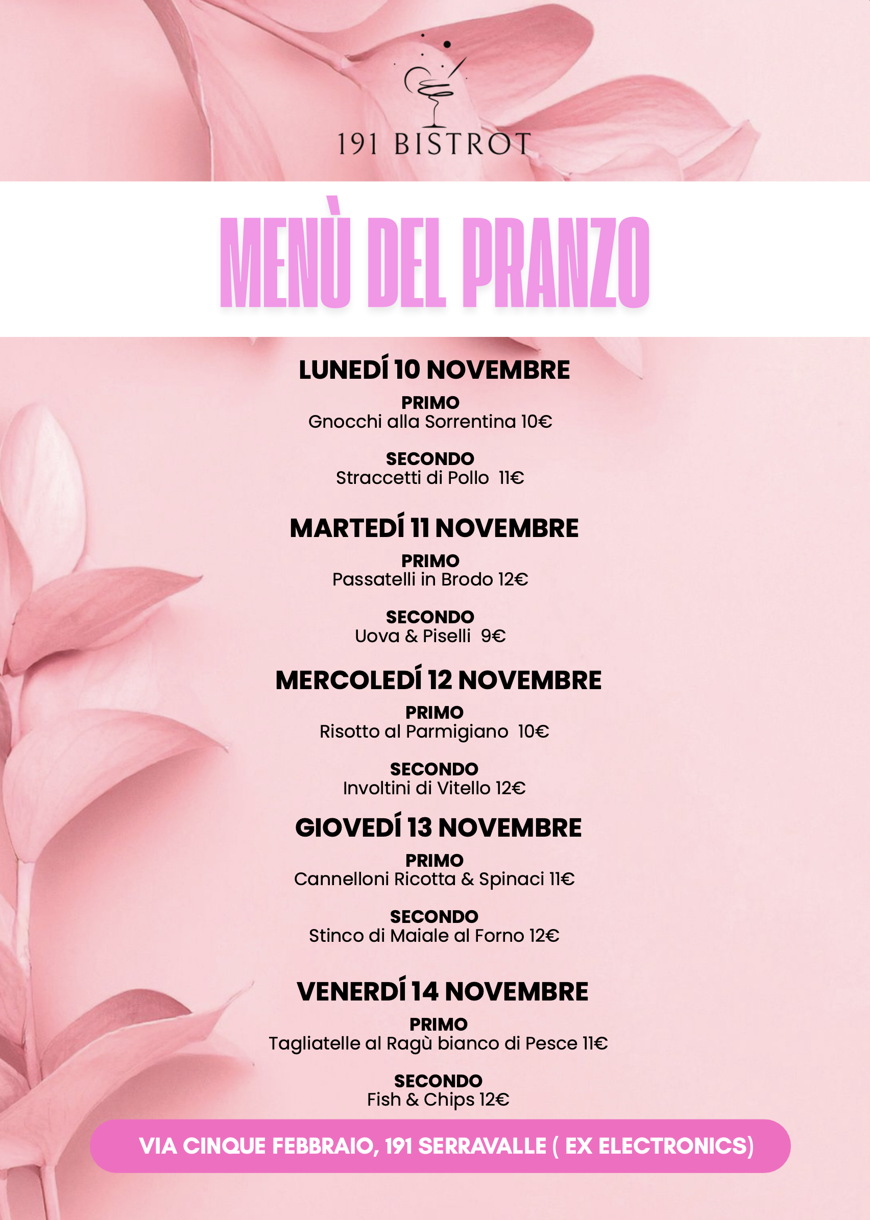 Ogni settimana al 191 Bistrot Coffee&Food trovi un menu diverso, pensato per offrirti piatti genuini, sapori autentici e la giusta pausa di gusto nel cuore di Serravalle.