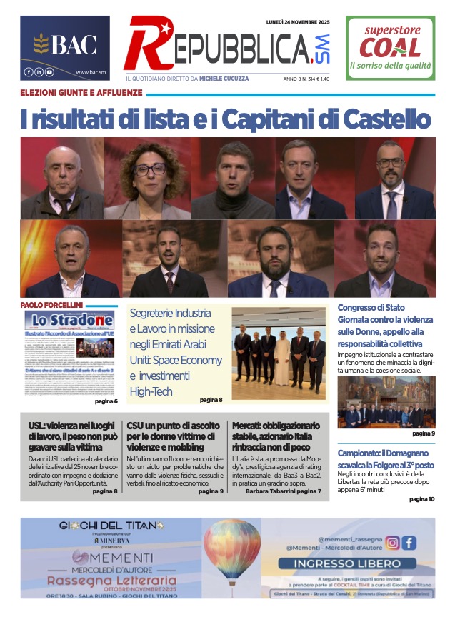 San Marino. Elezioni Giunte di Castello 2025. Il riepilogo con i dati definitivi Leggi tutto » 24/11/2025