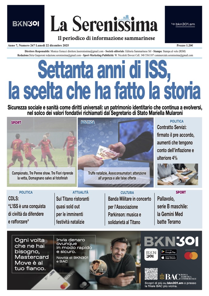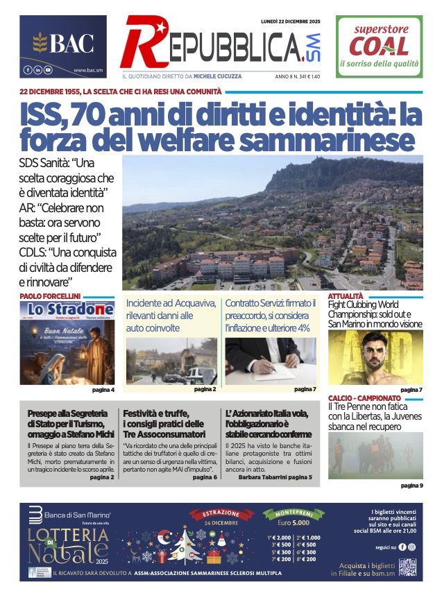 San Marino. 70 ANNI DI ISS: la sicurezza sociale come pilastro dell’identità sammarinese. Il comunicato della Segreteria Sanità Leggi tutto » 22/12/2025