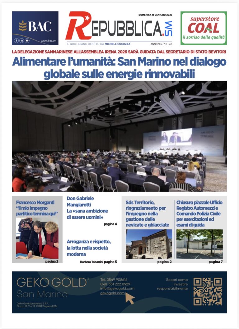 Sicurezza energetica e sostenibilità: San Marino protagonista ad Abu Dhabi per la 16ª Assemblea IRENA Leggi tutto » 11/01/2026