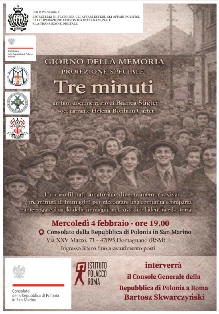 San Marino. Giorno della Memoria: proiezione del documentario “Tre minuti”. Mercoledì 4 febbraio, ore 19.00 – Consolato della Repubblica di Polonia Leggi tutto » 01/02/2026