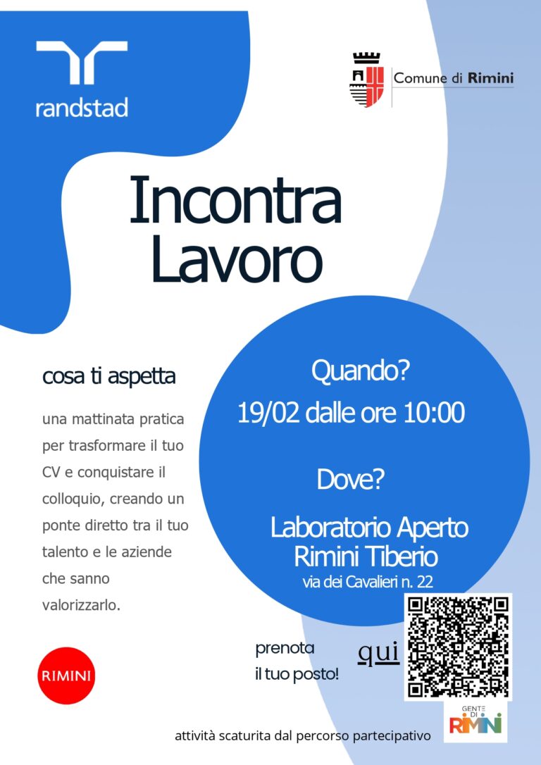 “Incontra Lavoro”: il Comune di Rimini e Randstad insieme per sostenere i giovani nella ricerca di occupazione. Giovedì 19 febbraio al Laboratorio Aperto Rimini Tiberio Leggi tutto » 19/02/2026