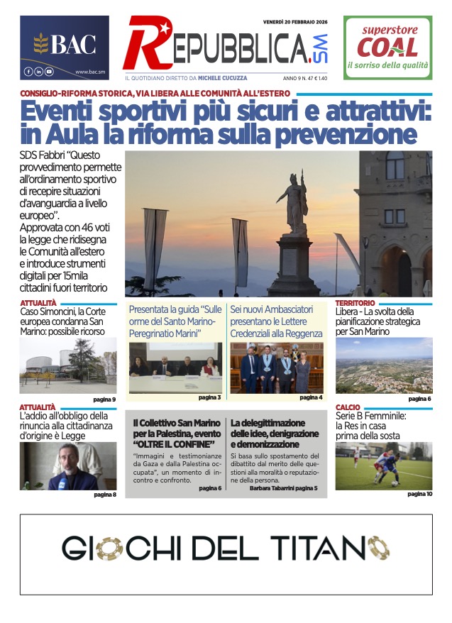 San Marino. Consiglio Grande e Generale – giovedì 19 febbraio, pomeriggio. In 2^ lettura il pdl “Comunita’ dei cittadini sammarinesi residenti all’estero” ed in 1^ “Disposizioni in materia di sicurezza durante le manifestazioni sportive” Leggi tutto » 20/02/2026