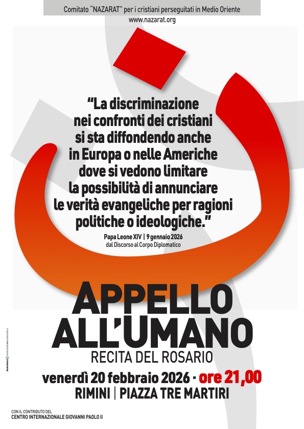 COMITATO NAZARAT PER I CRISTIANI PERSEGUITATI. Rimini stasera in Piazza Tre Martiri alle 21 recita del Rosario Leggi tutto » 20/02/2026