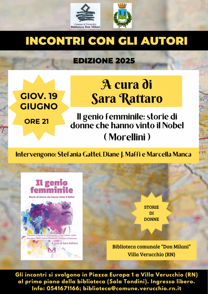 La biblioteca comunale “don Milani” di Villa Verucchio prosegue la sua rassegna estiva “Incontri con l’autore” con il terzo appuntamento previsto per giovedì 19 giugno alle ore 21, in Sala Tondini (primo piano della biblioteca, piazza Europa 1). L’evento, a ingresso libero, sarà dedicato al libro “Il genio femminile. Storie di donne che hanno vinto il Nobel” (Morellini, 2024), un’antologia che racconta la vita e le imprese di dodici straordinarie vincitrici del premio Nobel.