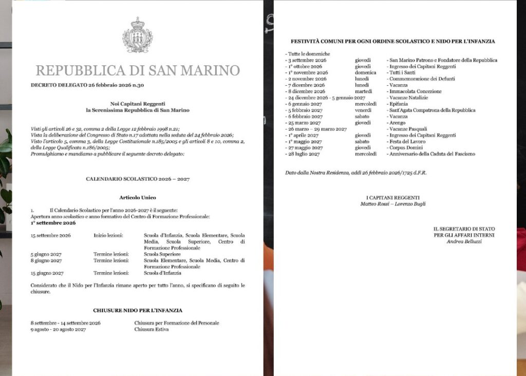 Adottato il calendario scolastico 2026/2027 nella Repubblica di San Marino che definisce tempi e scadenze delle attività didattiche per tutti gli ordini di scuola della Repubblica di San Marino.