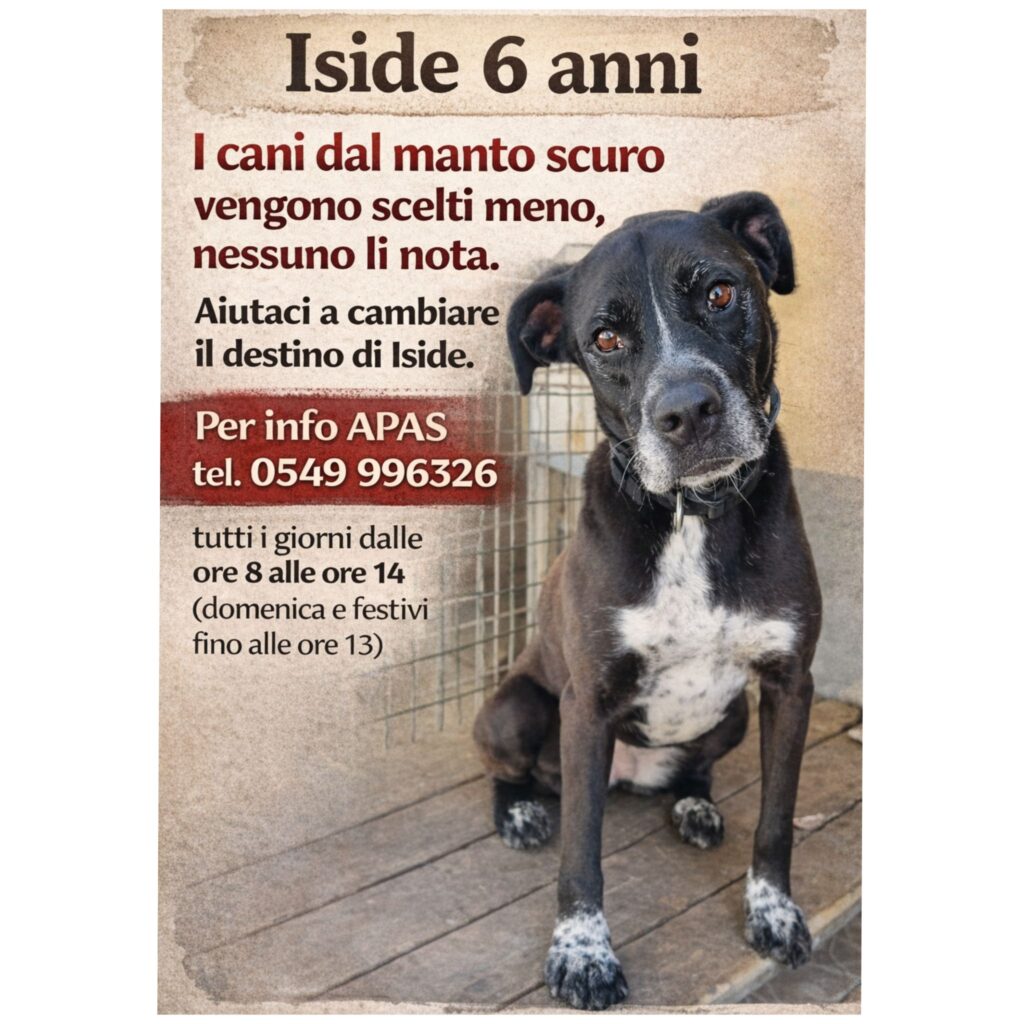 Ogni cane ha una storia che merita di essere scritta insieme a qualcuno che lo ami davvero ed il futuro di Iside è ancora una pagina bianca, pronta per essere riempita di amore, fiducia e nuove avventure. Per info APAS tel. 0549 996326 tutti i giorni dalle ore 8 alle ore 14 (domenica e festivi fino alle ore 13). Grazie per le condivisioni