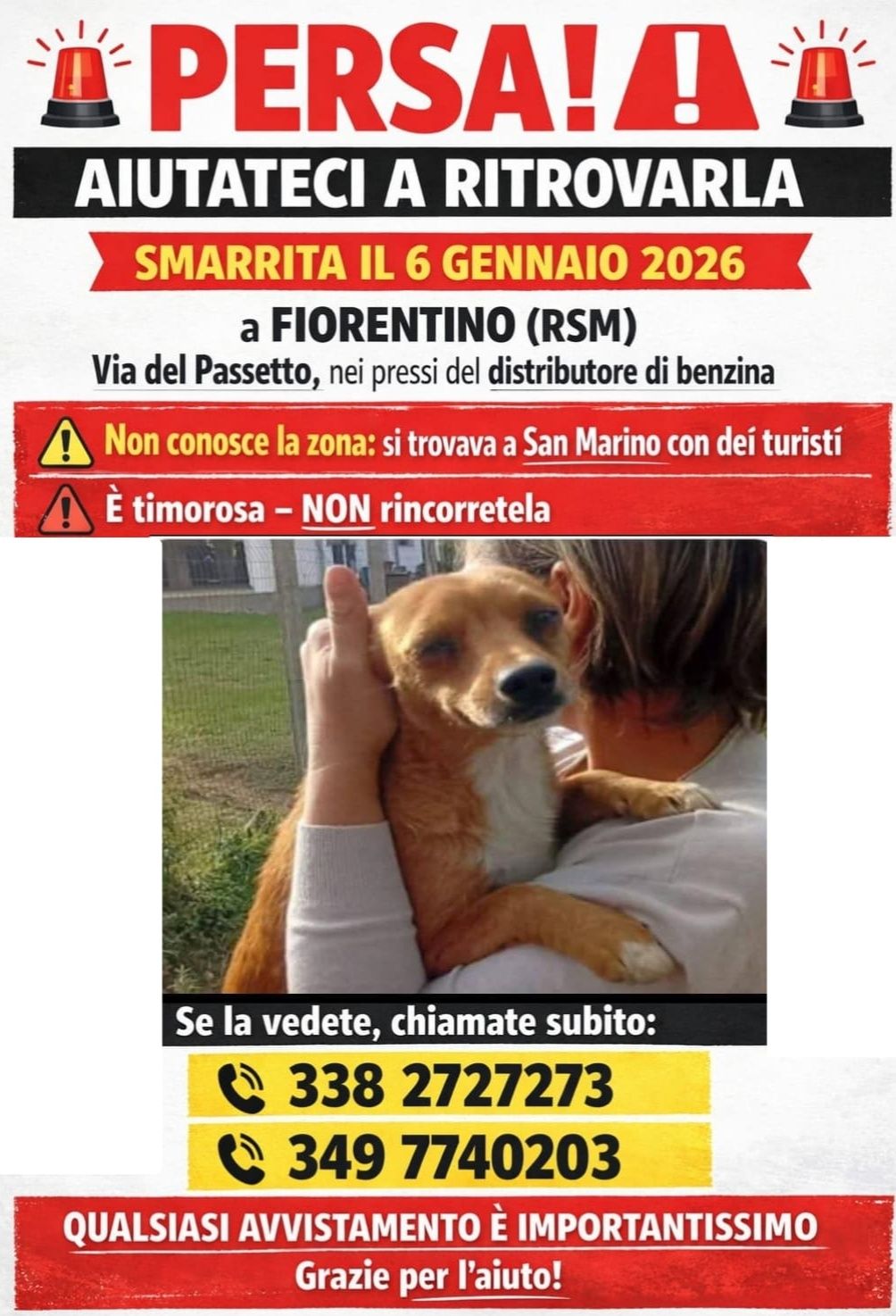 APAS San Marino. Sissy, cagnolina di turisti smarrita martedì 6 gennaio a Fiorentino. Ogni segnalazione è preziosa!