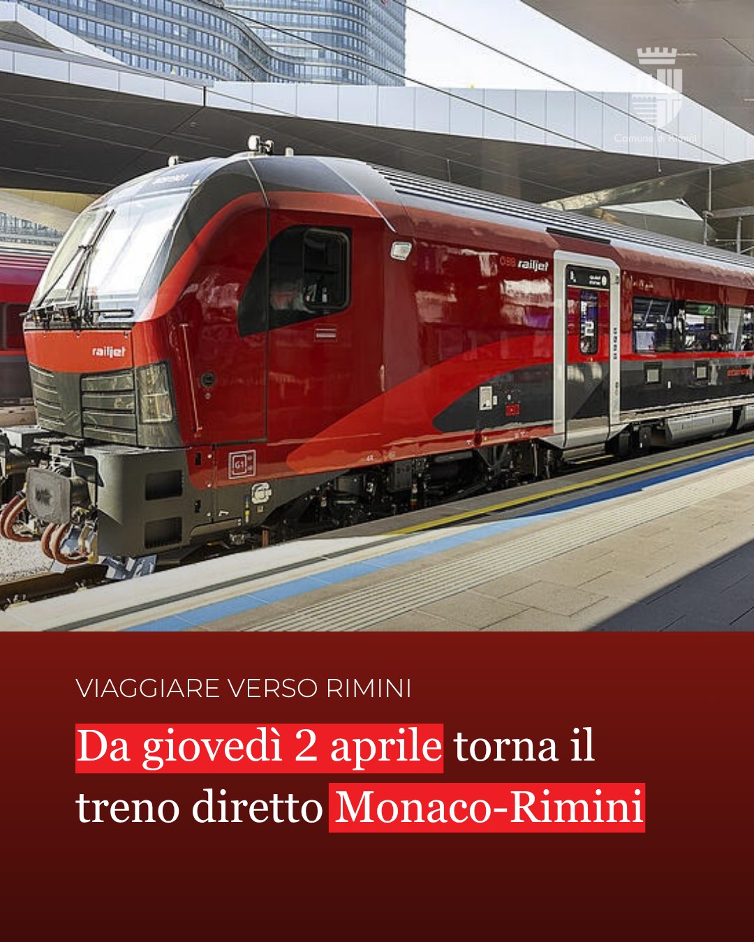 Railjet partirà da Monaco di Baviera ogni giorno, da giovedì 2 aprile, alle 9.23 del mattino, per raggiungere la destinazione finale, Cattolica (Rn) alle 18.16 (17.37 nei fine settimana), con fermate a Bologna, Cesena (FC), Rimini e Riccione (Rn).
