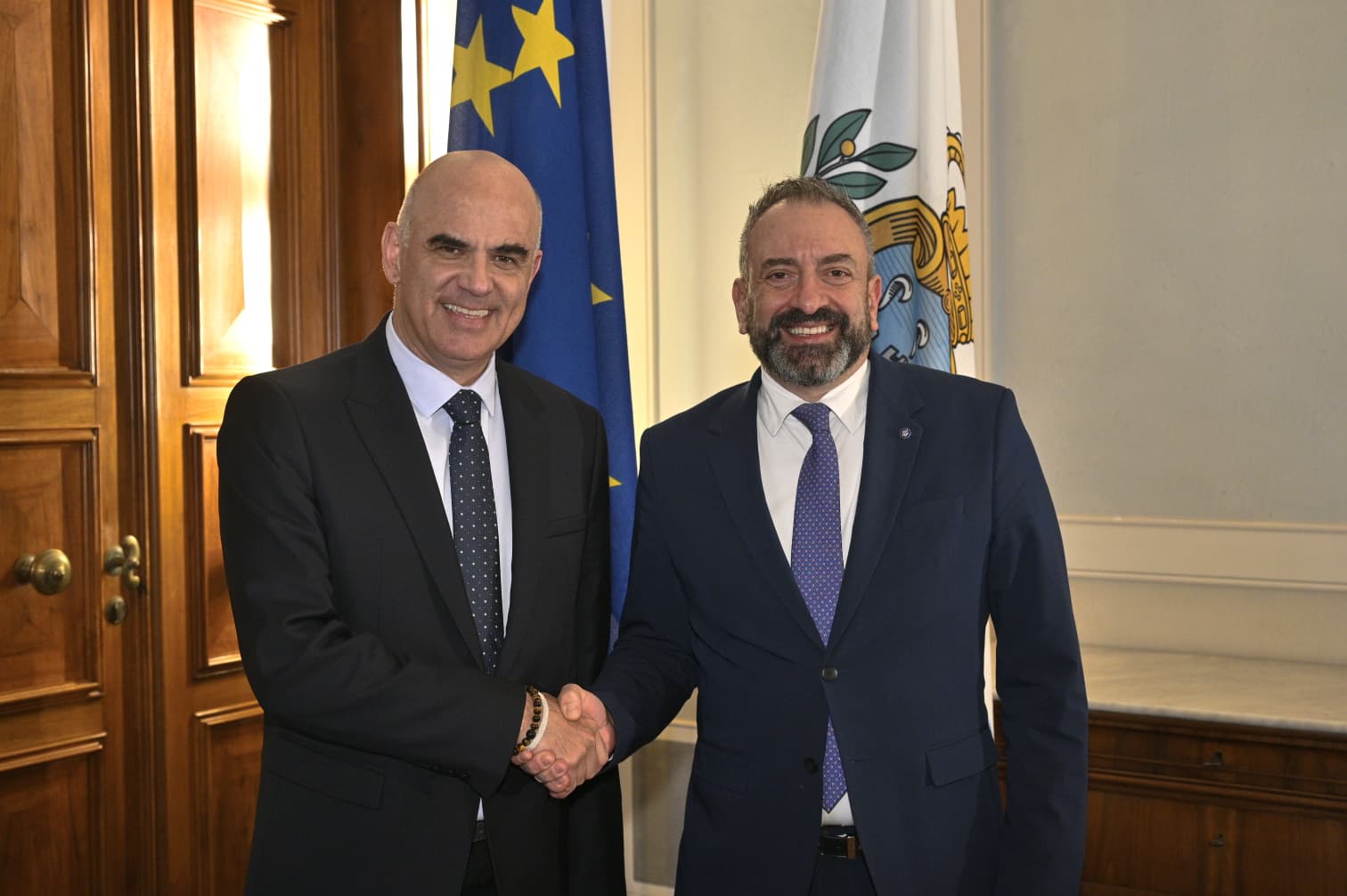 Il Segretario di Stato per gli Affari Esteri Luca Beccari ha accolto oggi, a Palazzo Begni, il Segretario Generale del Consiglio d’Europa, Alain Berset, che domani ricoprirà l’incarico di Oratore Ufficiale della Cerimonia di Insediamento degli Ecc.mi Capitani Reggenti.