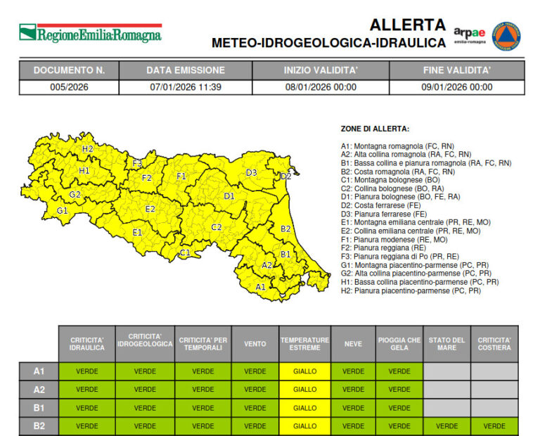 Ravenna. Protezione civile, allerta meteo gialla per temperature estreme dalla mezzanotte di oggi, mercoledì 7 gennaio, alla mezzanotte di domani, giovedì 8 gennaio Leggi tutto » 07/01/2026