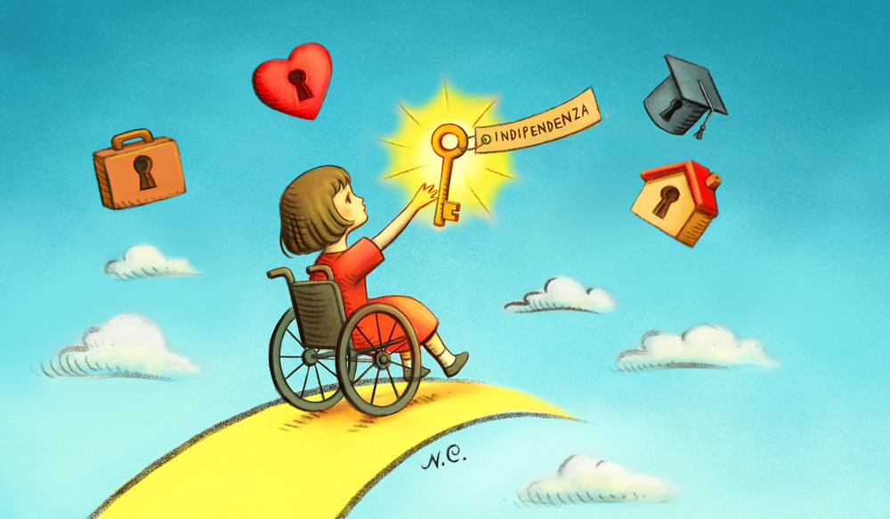 Le illustrazioni raccontano, con la forza poetica dell’arte, uno dei principi più importanti della Convenzione ONU sui diritti delle persone con disabilità. Nell’immagine una bambina in carrozzina guarda verso il cielo, dove fluttuano alcune dimensioni fondamentali della vita: la casa, lo studio, il lavoro, gli affetti. Tutte sembrano chiuse da una serratura.