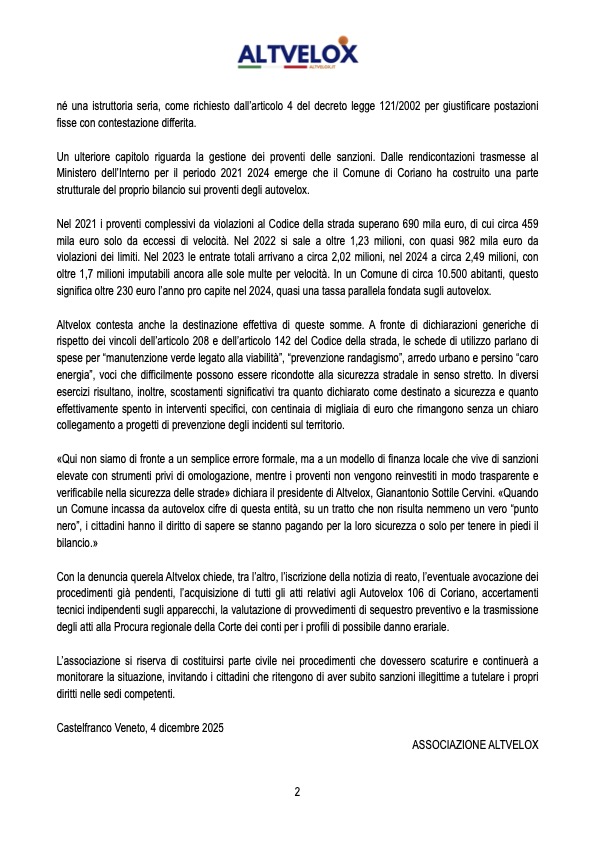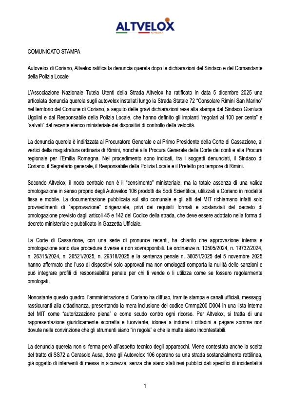 Autovelox di Coriano, Altvelox ratifica la denuncia querela dopo le dichiarazioni del Sindaco e del Comandante della Polizia Locale