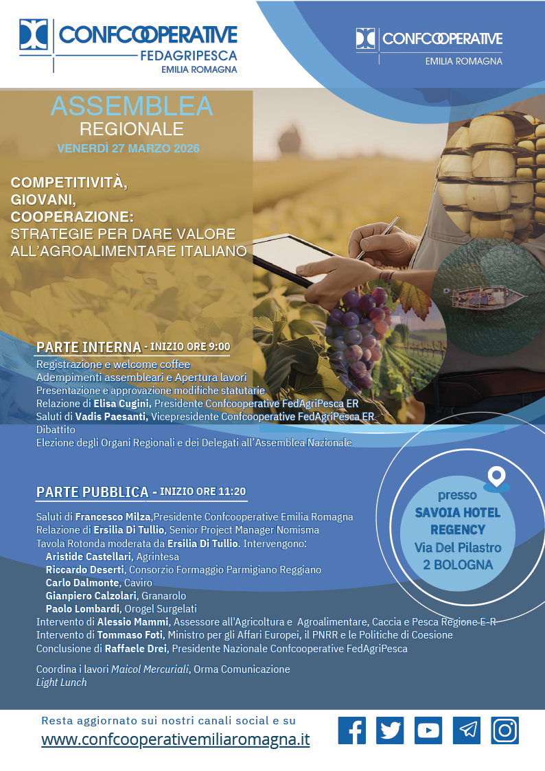 Venerdì prossimo, 27 marzo, il Savoia Hotel Regency di Bologna ospiterà l’assemblea regionale di Confcooperative Fedagripesca Emilia Romagna, l’organismo che riunisce le principali realtà cooperative del settore agricolo, agroalimentare e ittico. L’appuntamento, dal titolo “Competitività, giovani, cooperazione”, vedrà il confronto tra i vertici delle grandi filiere italiane e rappresentanti del governo per definire le nuove strategie del comparto.