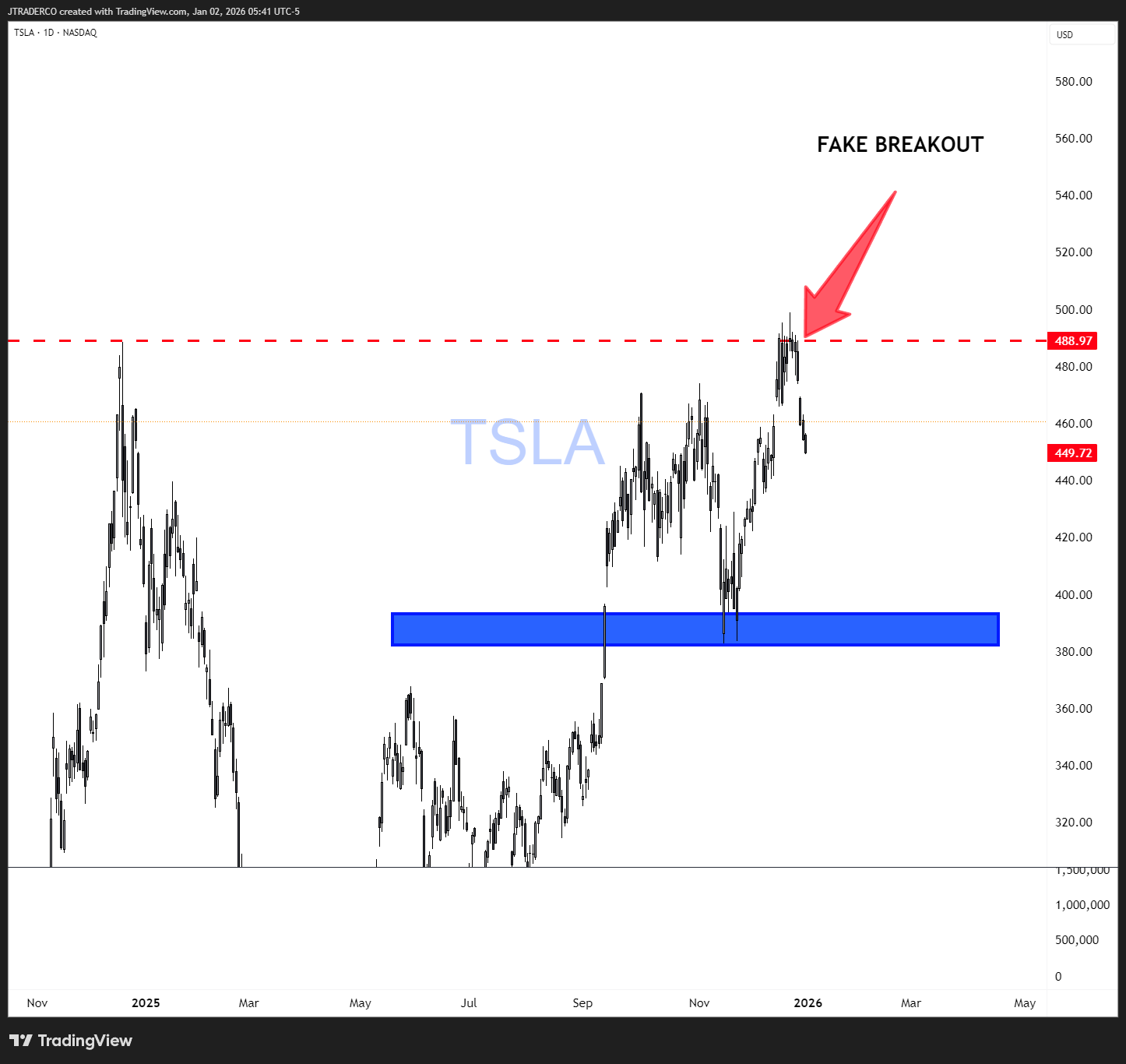 Tutti gli occhi erano puntati sulla rottura dei 500$ ed invece, fake breakout (falso breakout) con apertura di tante posizioni short target 400$. Quindi potrebbe TSLA anticipare quello che fara’ il Nasdaq?