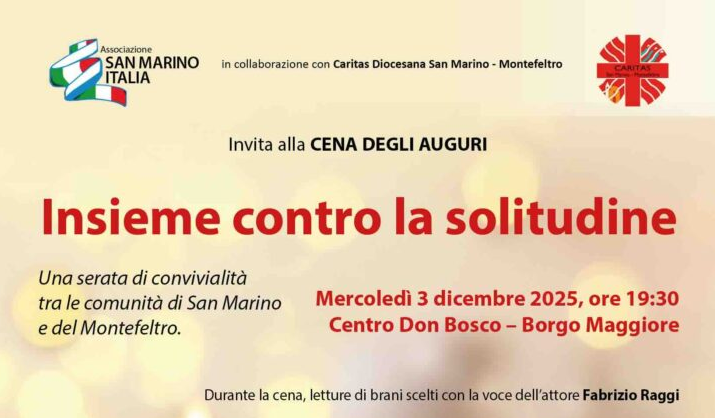 Unire le comunità di San Marino e del Montefeltro in una serata di convivialità per combattere un nemico invisibile ma pesante: la solitudine. È questo l’obiettivo della “Cena degli Auguri – Insieme contro la solitudine”, l’evento benefico che si terrà mercoledì 3 dicembre, alle 19:30, presso il Centro Don Bosco di Borgo Maggiore. Un’occasione per scambiarsi gli auguri e sostenere chi si sente ai margini.