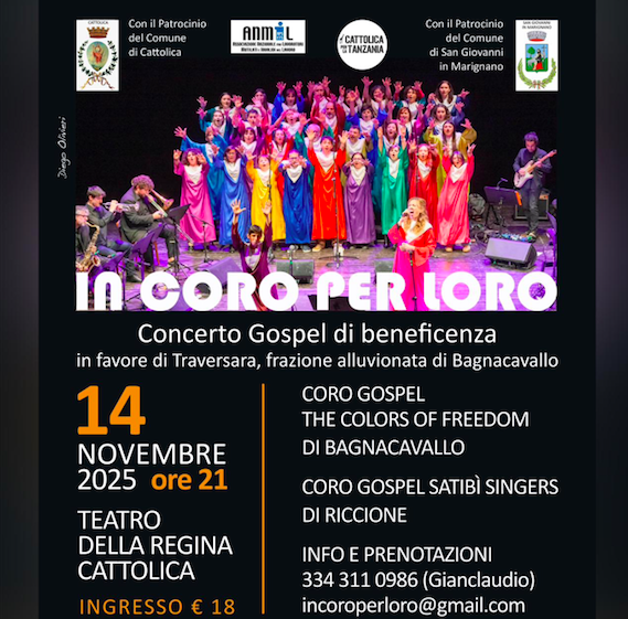 La musica gospel per non dimenticare l’alluvione del 2023. Cattolica e San Giovanni in Marignano uniscono le forze per Traversara, la frazione del comune di Bagnacavallo ancora segnata da quella ferita. L’appuntamento è per questo venerdì, 14 novembre, alle 21, al Teatro della Regina di Cattolica con il concerto benefico “In coro per loro”, il cui incasso sarà interamente devoluto per la ricostruzione di un centro aggregativo polivalente.