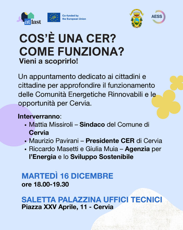 Durante la serata saranno illustrati nel dettaglio i meccanismi di partecipazione e lo stato dell’arte del progetto locale. Al tavolo dei relatori siederanno il sindaco Mattia Missiroli e il presidente dell’Associazione Comunita’ Energetica Rinnovabile di Cervia, Maurizio Pavirani. Il quadro tecnico sara’ approfondito da Riccardo Masetti e Giulia Muia dell’Agenzia per l’Energia e lo Sviluppo Sostenibile di Modena, l’ente che ha curato lo studio di fattibilita’ dell’operazione.