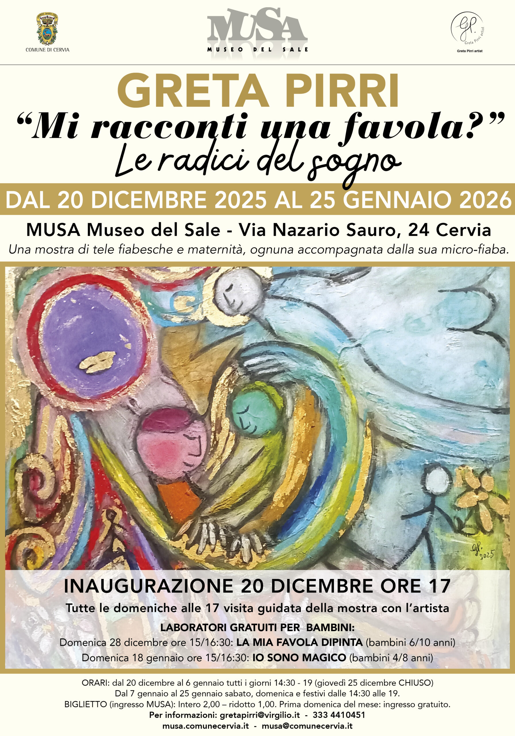 Un invito a rallentare, a fermare la corsa frenetica del quotidiano per ritrovare lo stupore perduto dell’infanzia. È questa l’atmosfera che accoglierà i visitatori del MUSA – Museo del Sale di Cervia a partire da questo sabato, 20 dicembre, con l’inaugurazione della mostra “Mi racconti una favola? Le radici del sogno”. Protagonista dell’esposizione, che aprirà i battenti alle ore 17 alla presenza dell’assessora alla Cultura Federica Bosi, è l’artista Greta Pirri, pittrice e poetessa capace di intrecciare colore e narrazione in un unico abbraccio visivo.