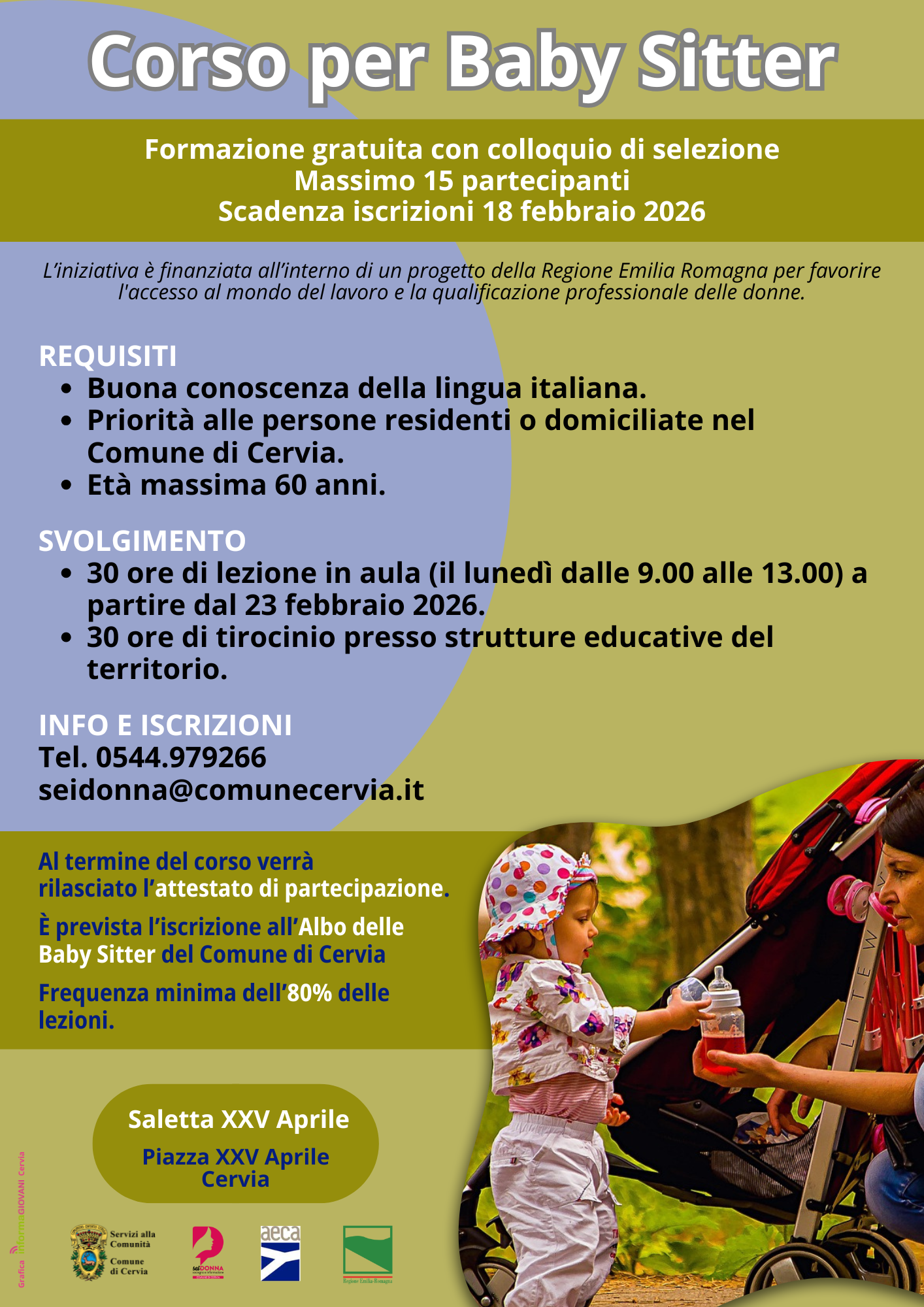 Formare baby sitter qualificate e offrire una concreta opportunità di lavoro alle donne del territorio. Con questo duplice obiettivo, il Comune di Cervia lancia un nuovo corso gratuito, con iscrizioni aperte fino al 18 febbraio prossimo. L’iniziativa, pensata per un massimo di 15 partecipanti, prevede un percorso completo di lezioni in aula e un tirocinio pratico, con la possibilità finale di essere inserite nell’albo comunale ufficiale.