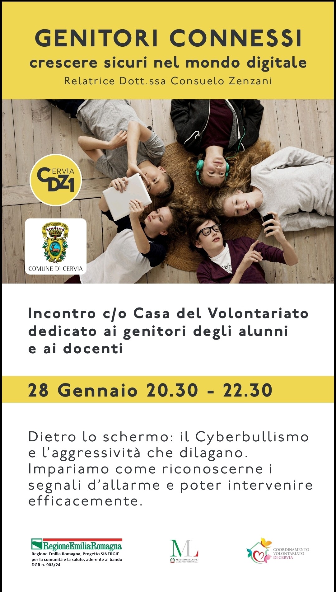 Riconoscere i segnali del disagio digitale e trasformare la rabbia in dialogo. È questo il cuore del terzo appuntamento della rassegna “Genitori connessi – Crescere sicuri nel mondo digitale”, in programma mercoledì prossimo, 28 gennaio, a Cervia. L’iniziativa, promossa dal Consiglio di zona n. 1 Cervia centro Malva Sud Bova con il sostegno dell’Amministrazione comunale, chiama a raccolta famiglie e insegnanti per un confronto aperto sulle insidie della rete.