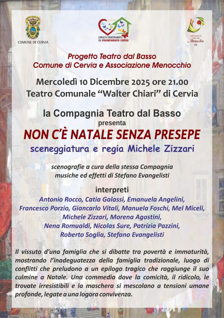 L’obiettivo, spiega il regista partenopeo e cervese d’adozione Michele Zizzari, è costituire “un gruppo stabile di teatro contemporaneo di qualità e impegno civile, attivo sul territorio”, capace di portare i propri spettacoli nelle piazze e nei teatri della regione. Un’esperienza che ha già dato frutti importanti, con allestimenti come “Esperando” e “Ni Una Màs” che hanno raccolto l’apprezzamento del pubblico a Cervia e Santarcangelo. E proprio il prossimo 10 dicembre, alle 21, il Teatro comunale di Cervia ospiterà “Non c’è Natale senza presepe”, lo spettacolo nato dall’ultimo laboratorio.