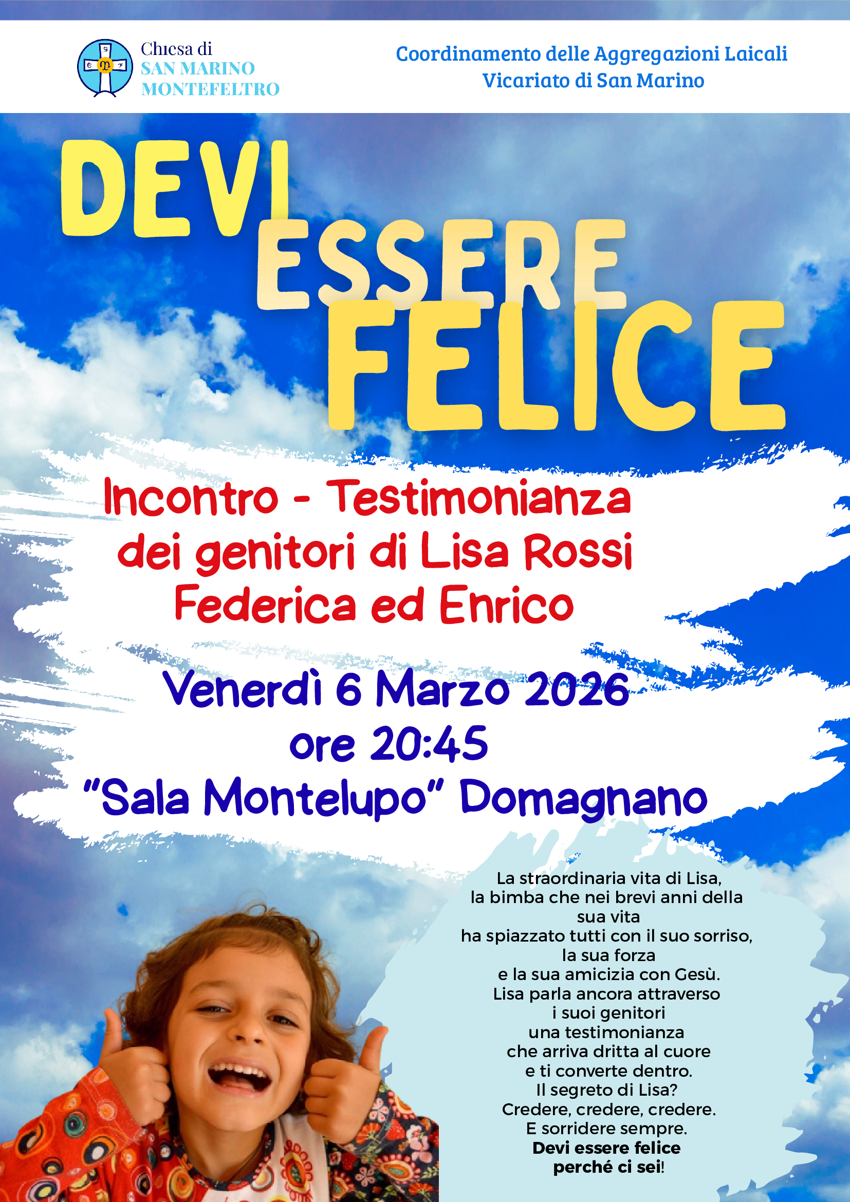 Chiesa di San Marino-Montefeltro: incontro testimonianza dei genitori di Lisa Rossi, Federica ed Enrico. Venerdì 6 marzo ore 20,45, Sala Montelupo – Domagnano
