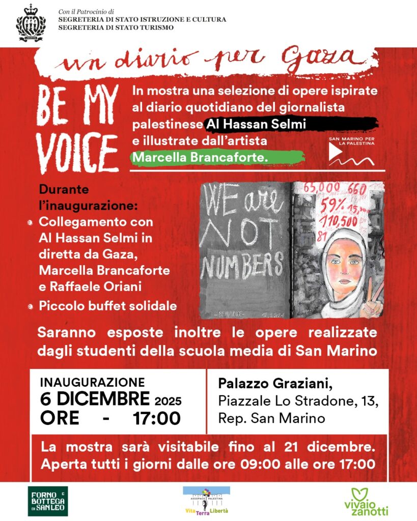Collettivo San Marino per la Palestina: mostra “BE MY VOICE, un diario per Gaza”. Inaugurazione sabato 6 dicembre alle ore 17.00 presso Palazzo Graziani