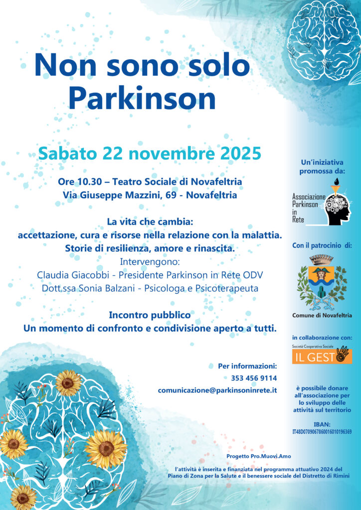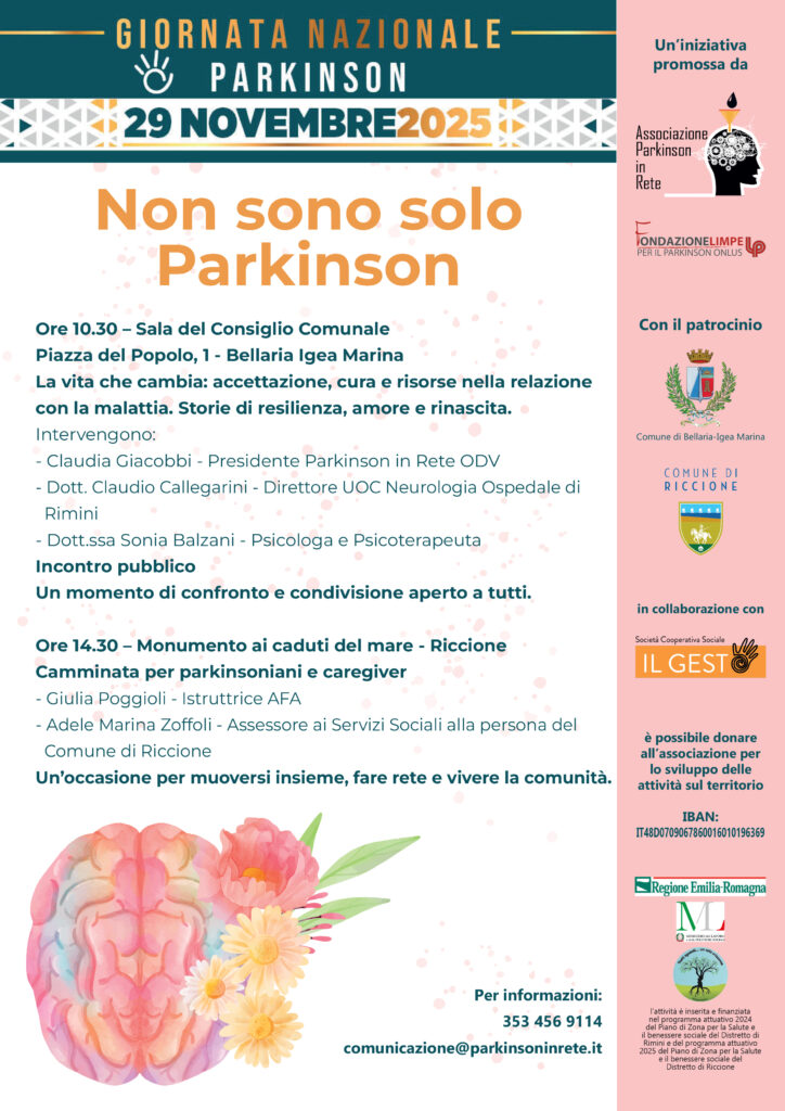 Riccione, 18/11/2025 -Un momento per promuovere consapevolezza, sostegno e comunità. In occasione della Giornata Nazionale contro il Parkinson, l’Associazione Parkinson in Rete ODV promuove due importanti momenti di incontro e sensibilizzazione sul tema del Parkinson, con l’obiettivo di diffondere conoscenza, creare connessioni significative e offrire occasioni di confronto aperte alla cittadinanza.