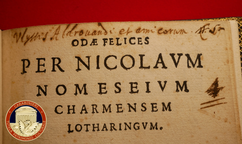 Il 24 febbraio 2026, con una cerimonia privata, il Nucleo Carabinieri Tutela Patrimonio Culturale di Torino ha restituito alla Biblioteca Comunale dell’Archiginnasio di Bologna un rarissimo opuscolo dal titolo “Odae felices, per Nicolaum Nomeseium”, edito nel 1588, facente parte di una donazione alla biblioteca relativa a una raccolta libraria appartenuta al marchese Aldobrandino Malvezzi de’ Medici (1881–1961), avvenuta nel 1931 e costituita da oltre 22.000 volumetti e opuscoli dei secoli XIII-XVIII. L’opera archivistica è risultata mancante dagli inventari di catalogazione post bellici, dopo i bombardamenti che colpirono la città di Bologna e, in particolare, il palazzo dell’Archiginnasio nel 1944 durante il secondo conflitto mondiale.