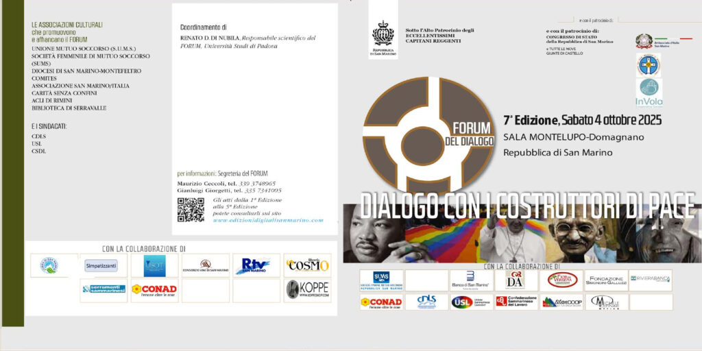È questo il cuore del settimo Forum “Dialogo con i Costruttori di Pace”, che torna a San Marino il 4 ottobre nella Sala Montelupo di Domagnano.