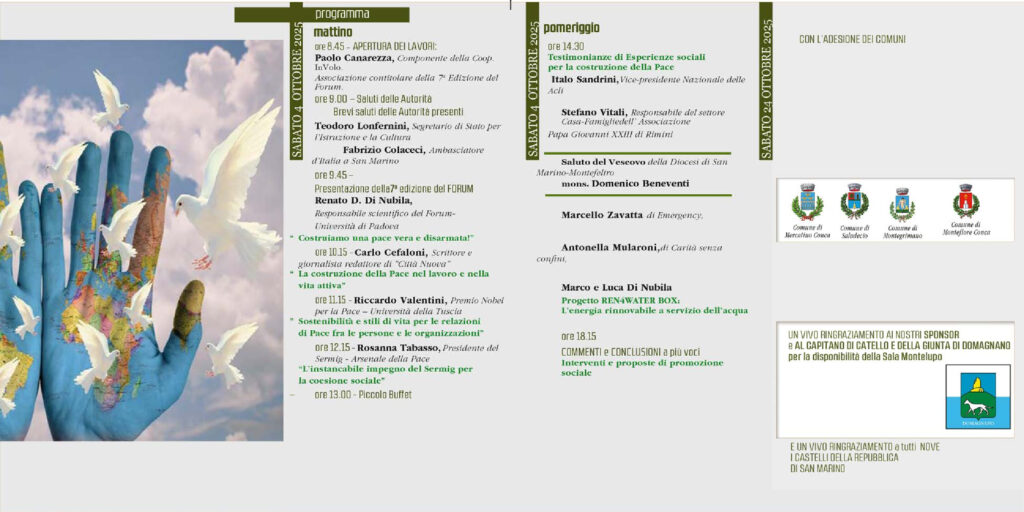 Il Forum, coordinato dall’ideatore Prof. Renato Di Nubila, Responsabile scientifico, che si avvale – come nella precedente edizione – dell’organizzazione in capo alla Cooperativa sociale Involo, promosso con il patrocinio delle istituzioni sammarinesi, italiane e della Diocesi San Marino-Montefeltro, propone riflessioni guidate da esperti e testimonianze concrete, per affrontare la costruzione della pace nei luoghi della vita quotidiana: nel lavoro, nella scuola, nella comunità.