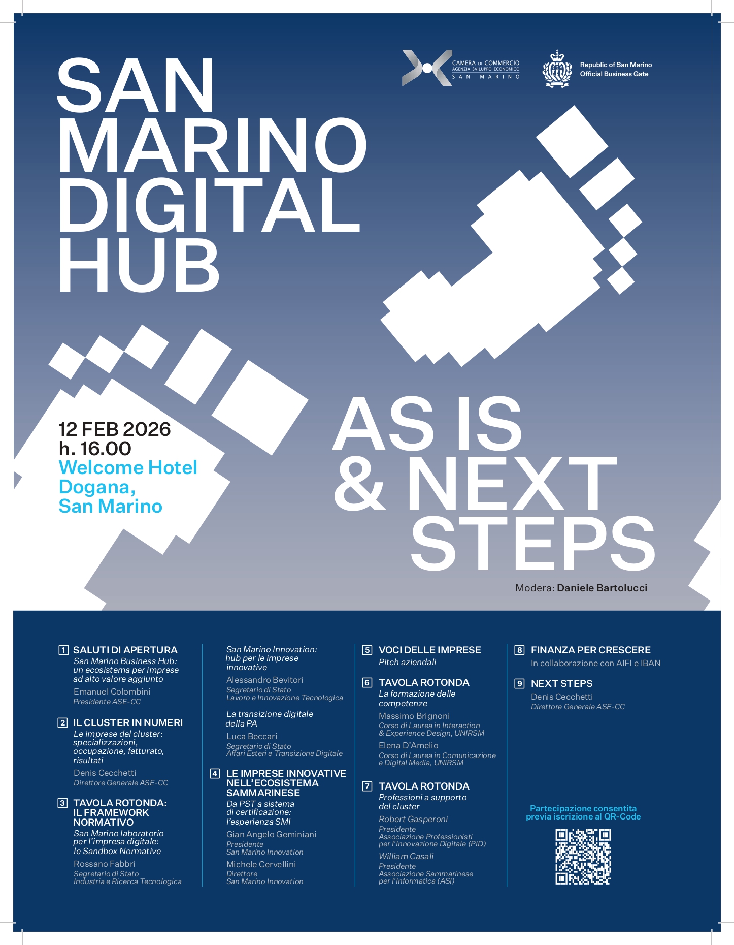 L’iniziativa, come annunciato in una nota dall’Agenzia per lo Sviluppo Economico – Camera di Commercio (ASE-CC), rappresenta un’importante occasione di confronto aperto sul presente e sulle prospettive dell’ecosistema digitale sammarinese. L’incontro punta a riunire istituzioni, operatori del settore e stakeholder per analizzare lo scenario attuale e tracciare le prossime traiettorie di crescita.
