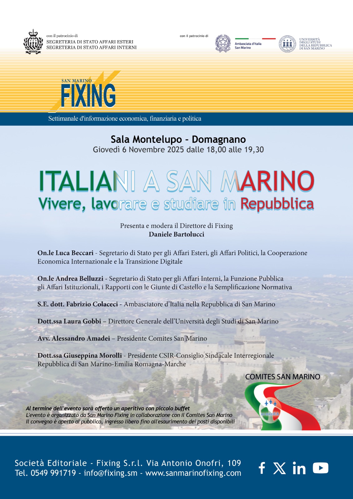 Il parterre di relatori è stato scelto per garantire un quadro completo e autorevole. Interverranno infatti il Segretario di Stato per gli Affari Esteri, Luca Beccari, e il Segretario di Stato per gli Affari Interni, Andrea Belluzzi. Al loro fianco, l’Ambasciatore d’Italia nella Repubblica di San Marino, S.E. Fabrizio Colaceci. A completare il panel di esperti saranno Laura Gobbi, Direttore Generale dell’Università degli Studi di San Marino, Alessandro Amadei, Presidente del Comites San Marino, e Giuseppina Morolli, Presidente del Consiglio Sindacale Interregionale (CSIR) San Marino-Emilia Romagna-Marche. A moderare il dibattito sarà il direttore di Fixing, Daniele Bartolucci.