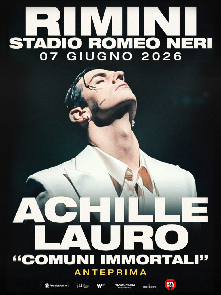 Il calendario di Achille Lauro si arricchisce di un nuovo, imperdibile appuntamento: il 7 giugno 2026 allo Stadio Romeo Neri di Rimini andrà in scena l’Anteprima di “Comuni Immortali”, il progetto live che il prossimo anno porterà per la prima volta l’artista allo Stadio Olimpico di Roma (10 giugno, già sold-out) e allo Stadio San Siro di Milano (15 giugno, ultimi biglietti disponibili).