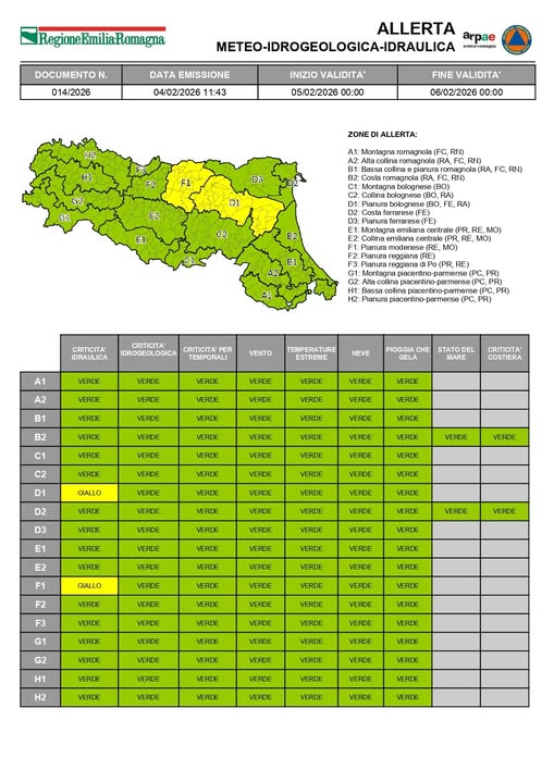 Nonostante il miglioramento delle condizioni atmosferiche e l’assenza di nuove precipitazioni rilevanti – spiega la bacheca Facebook di MeteoRoby, l’attenzione resta alta sul reticolo idrografico dell’Emilia-Romagna. In un bollettino diffuso dalla Protezione Civile regionale e da Arpae, è stata emessa l’allerta numero 014/2026, che impone il codice giallo per rischio idraulico per l’intera giornata di domani, giovedì 5 febbraio. Nel mirino dei tecnici ci sono le province di Reggio Emilia, Modena, Bologna, Ferrara e Ravenna.