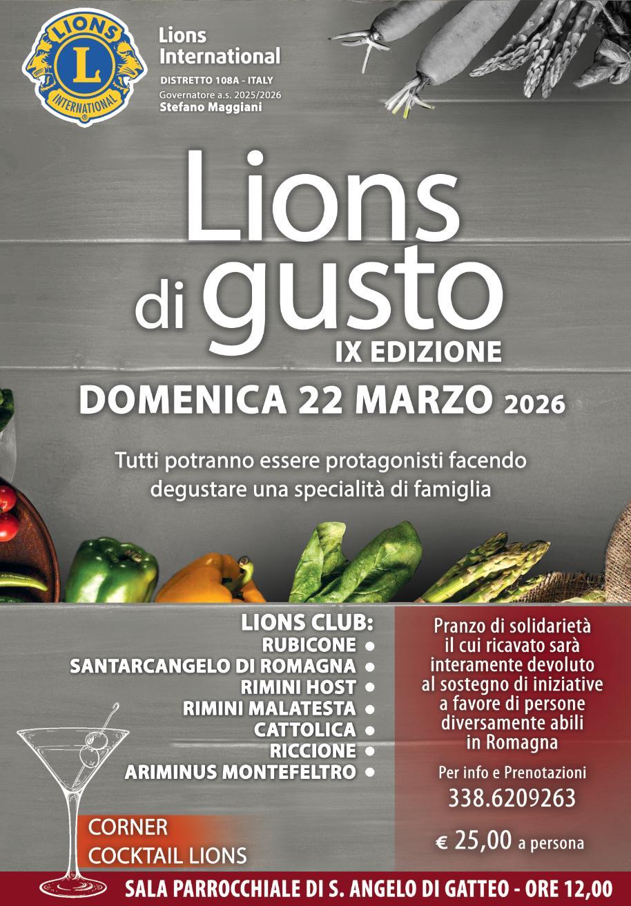 La solidarietà torna a tavola con la nona edizione di “Lions di Gusto”, l’iniziativa conviviale promossa dai Lions Club del territorio che coniuga la passione per la cucina con l’impegno verso il sociale. L’appuntamento, aperto a tutta la cittadinanza, è fissato per domenica 22 marzo 2026, alle ore 12:00, presso la sala parrocchiale di Sant’Angelo di Gatteo.
