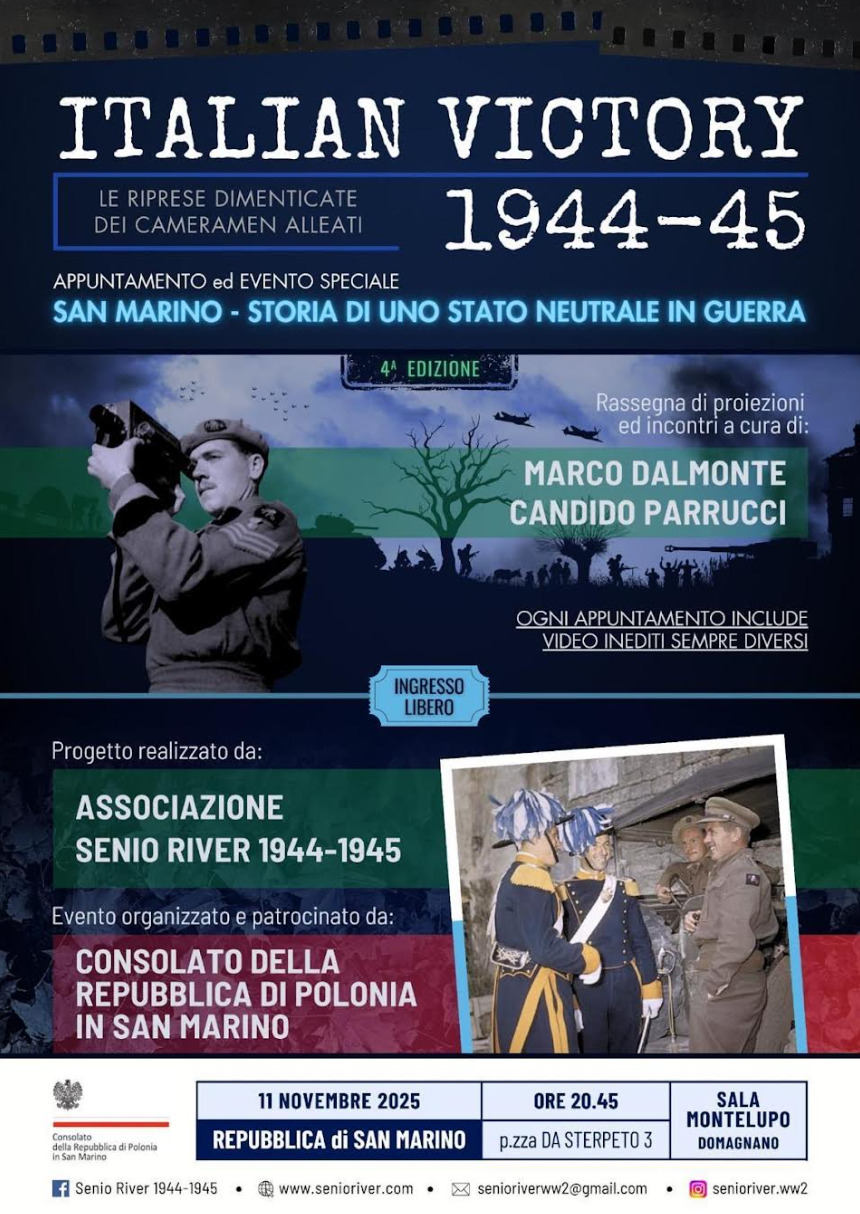 La serata approfondirà il ruolo della Repubblica del Titano durante la Seconda Guerra Mondiale, con particolare attenzione al rapporto con il 2° Corpo Polacco, protagonista della liberazione dell’Italia e attivo nei territori prossimi a San Marino. Una selezione di filmati originali — alcuni dei quali inediti, provenienti dagli archivi alleati e tedeschi — offrirà un percorso visivo attraverso il 1944: dal bombardamento del 26 giugno al progressivo avvicinarsi del fronte, fino all’arrivo delle truppe britanniche, indiane, gurkha, tedesche e dei comandanti alleati e polacchi.
