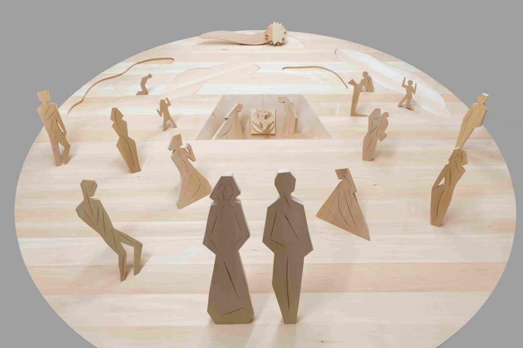 L’opera centrale dell’esposizione propone una visione essenziale e geometrica della Natività, scolpita nel legno di tiglio. Abbandonata l’iconografia della capanna classica, Di Capua ha ideato una superficie circolare inclinata dove lo spazio sacro è ricavato per sottrazione. Al centro, il Bambino è sospeso in una culla formata da elementi quadrati e circolari sovrapposti, simboli dell’unione tra Terra e Cielo, mentre le altre figure si dispongono attorno con rispetto sotto una stella dominante.
