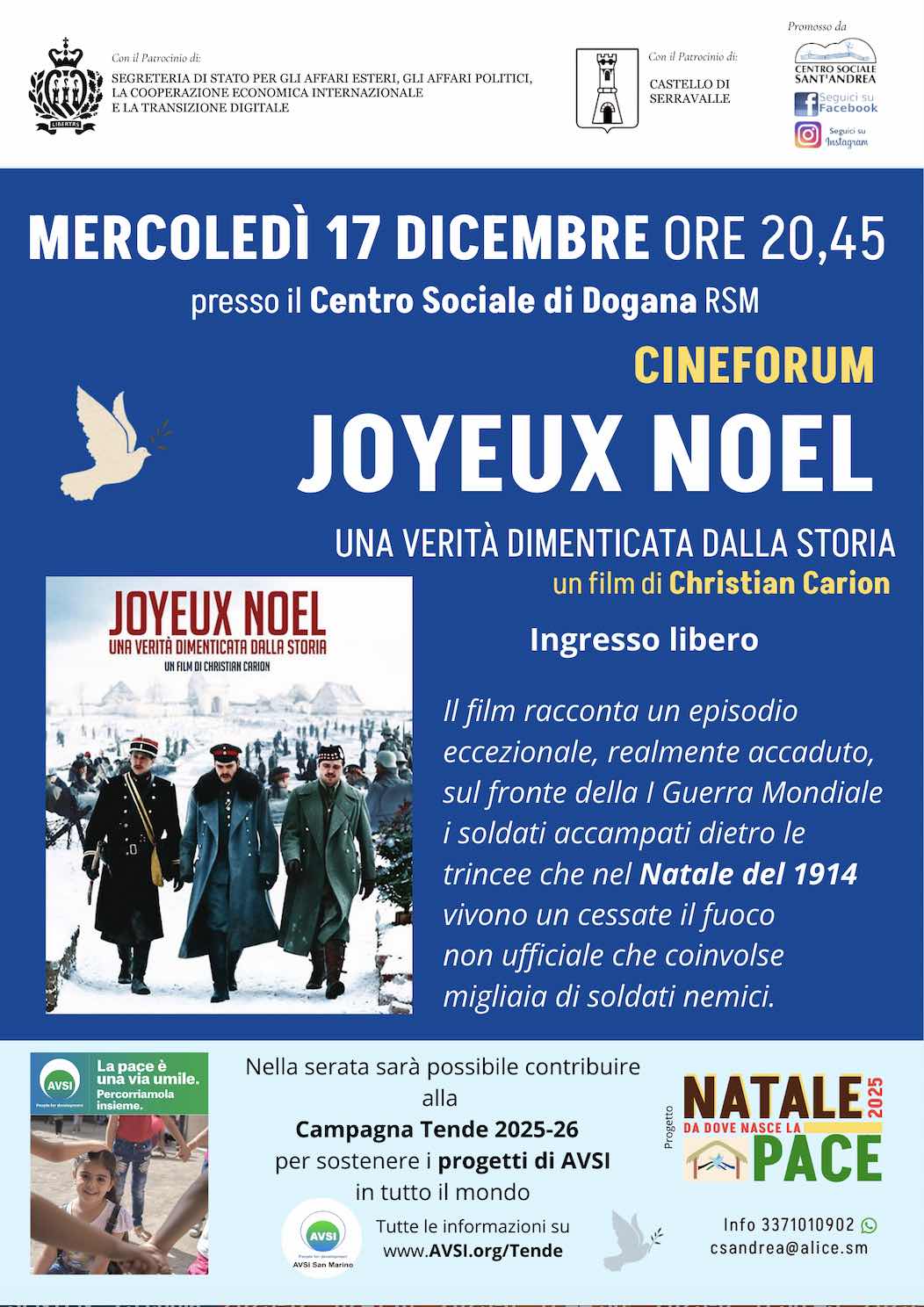 Primo appuntamento Mercoledì 17 dicembre presso il Centro Sociale di Dogana (RSM) alle ore 20,45 un interessante Cineforum con la pellicola:Joyeux Noel – Una verità dimenticata dalla storia con ingresso libero.