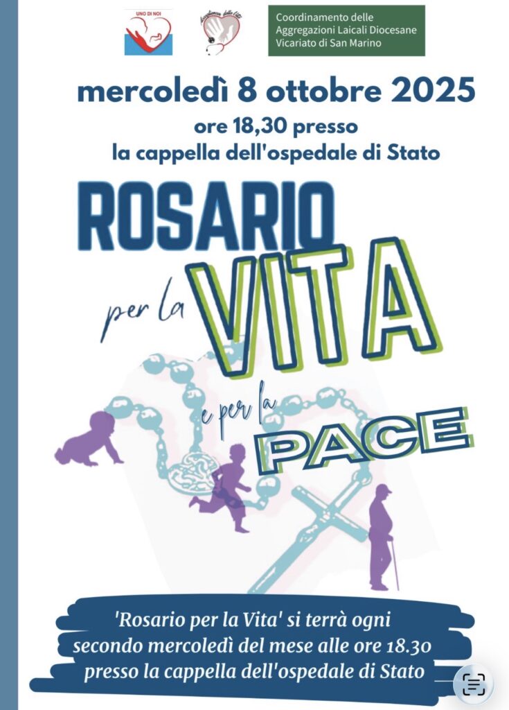 È per questo che noi preghiamo per la vita, la più indifesa, quella che vive nel grembo della mamma. Ed è per questo che ci ritroveremo mercoledì 8 ottobre 2025 alle ore 18,30 presso la cappella dell’Ospedale di Stato a pregare e a recitare il Rosario. E sappiamo che questa preghiera è anche un potente antidoto contro la guerra, ogni guerra, e ci porterà la pace, quella vera, come ci ha insegnato Gesù di Nazaret.