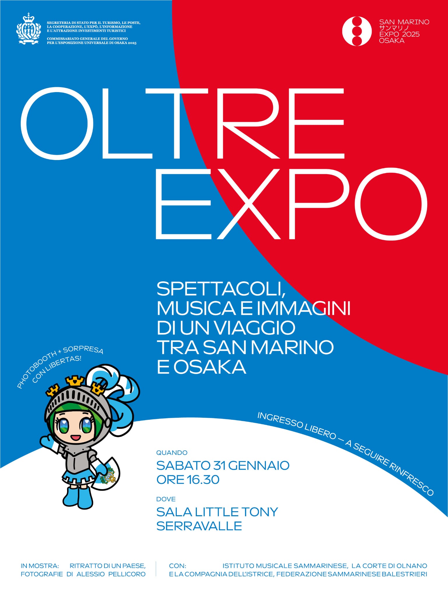 Al centro dell’evento le performance culturali che hanno rappresentato lo spirito della Repubblica di San Marino a Osaka un’occasione per mettere in scena e vivere la ricca identità culturale della Repubblica, simbolo di libertà e indipendenza millenaria, con i suggestivi contributi della Federazione Balestrieri, le performance della Corte di Olnano e della Compagnia dell’Istrice, i rappresentanti dell’Istituto Musicale Sammarinese, una mostra fotografica, l’esposizione degli oggetti iconici che hanno segnato la partecipazione e una serie di interviste e testimonianze dirette per raccontare la genesi del progetto e il vissuto della delegazione sammarinese.