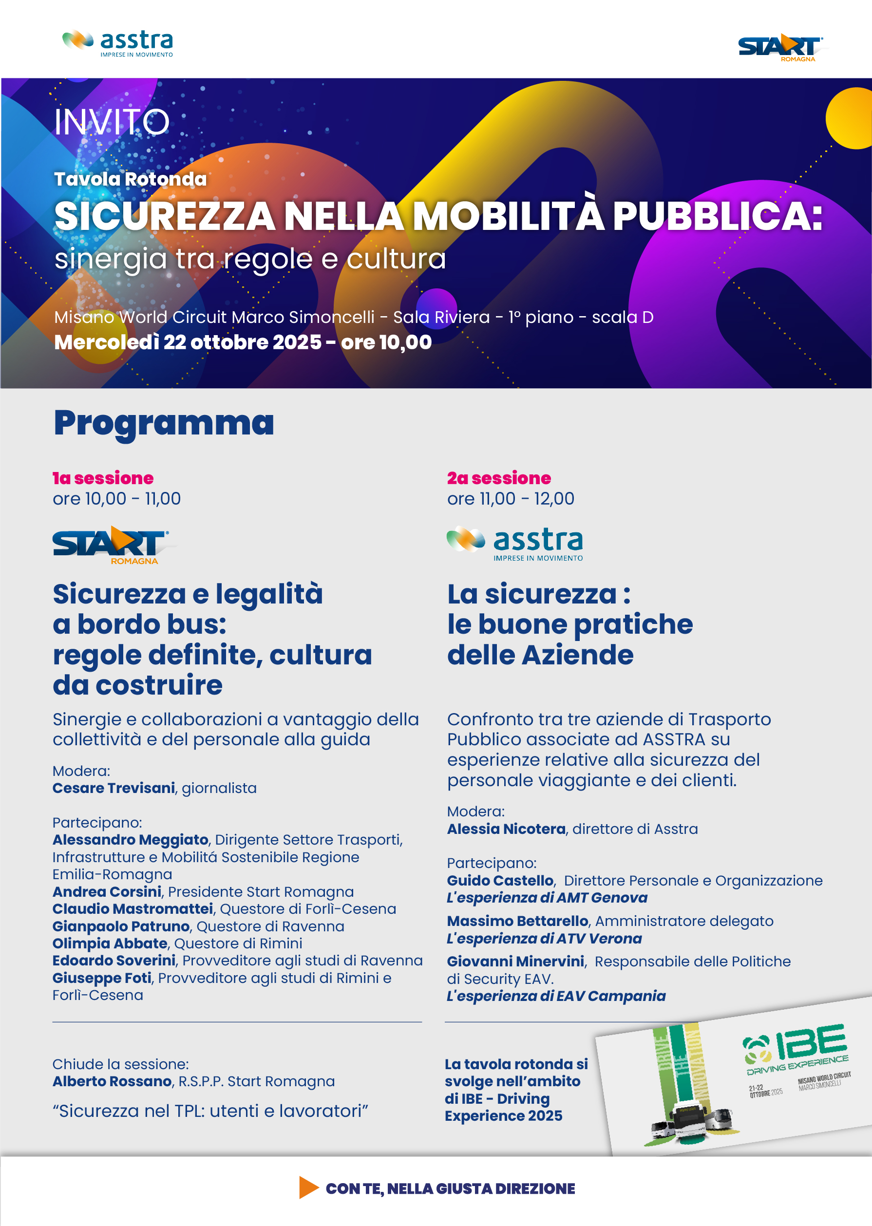 La sicurezza a bordo dei mezzi pubblici non è solo una questione di regole, ma anche di cultura. Partendo da questo presupposto, Start Romagna accende un faro sul tema riunendo studenti, istituzioni e addetti ai lavori in un convegno che si terrà domani, mercoledì 22 ottobre, nella cornice del Misano World Circuit. L’appuntamento è parte del programma di IBE Driving Experience, il salone di Italian Exhibition Group dedicato al trasporto pubblico.