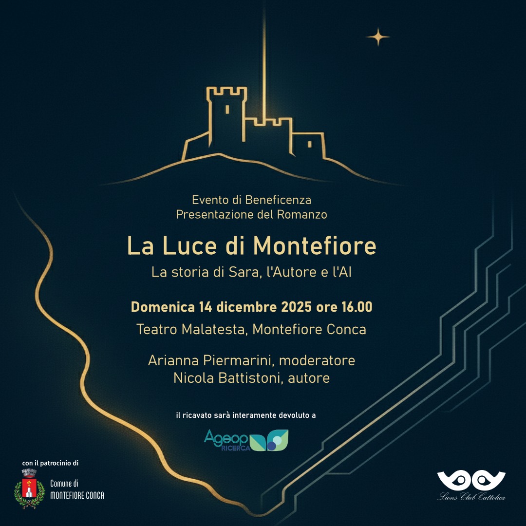 Una favola nata per esaudire un desiderio spezzato si trasforma in un abbraccio solidale per chi combatte ogni giorno contro la malattia. Il Teatro Malatesta di Montefiore Conca si prepara ad accogliere, questa domenica 14 dicembre alle ore 16.00, la presentazione ufficiale del romanzo “La Luce di Montefiore”, opera dello scrittore locale Nicola Battistoni. Un evento che unisce letteratura, memoria e beneficenza, patrocinato dal Comune e organizzato in collaborazione con il Lions Club Cattolica.