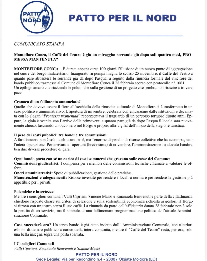 • Montefiore Conca. Patto per il Nord sulla chiusura del Caffè del Teatro
