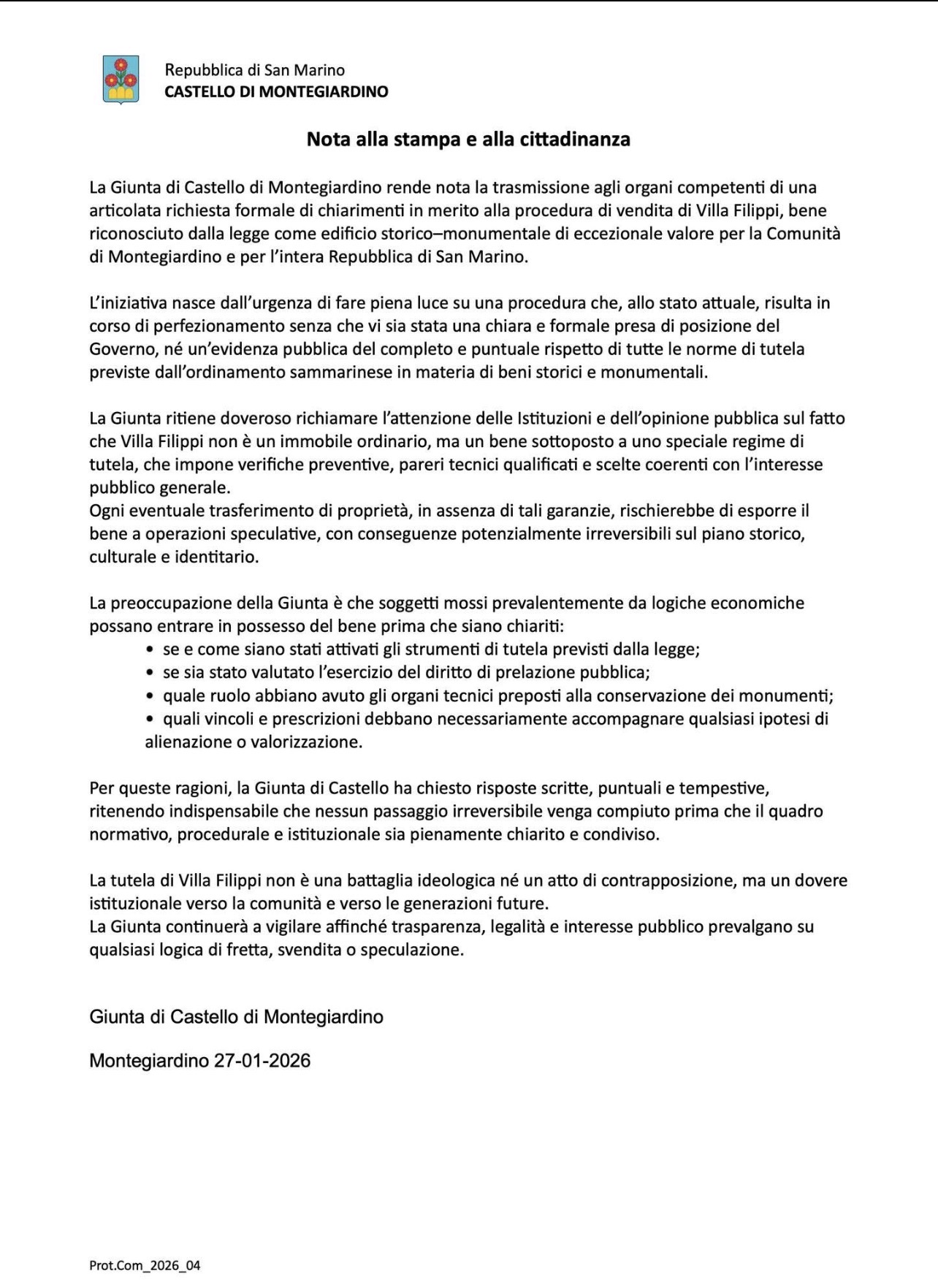 Oggi, la Giunta di Castello di Montegiardino ha trasmesso agli organi istituzionali competenti una richiesta formale di chiarimenti in merito alla procedura di vendita di Villa Filippi, bene riconosciuto dalla legge come edificio storico–monumentale e patrimonio culturale della Repubblica di San Marino.