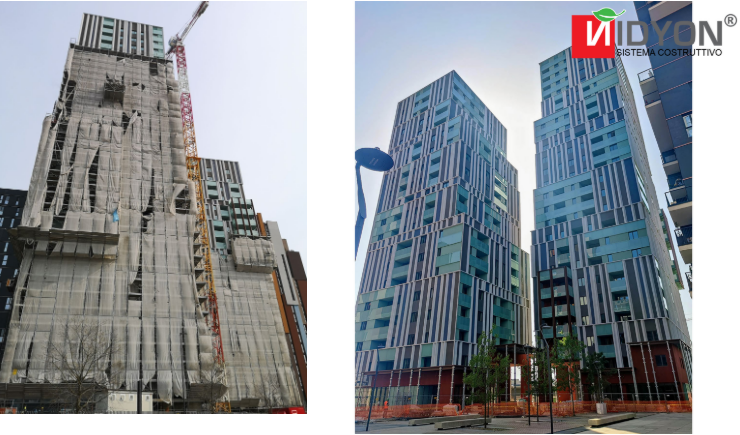 Nel corso degli anni, infatti, Nidyon ha contribuito (e contribuisce quotidianamente con i suoi numerosi cantieri sparsi in tutta Italia — n.d.r.) alla realizzazione di complessi residenziali e sviluppi urbani di grande scala. Tra questi, spiccano importanti progetti a livello nazionale, come gli edifici residenziali realizzati nell’ambito di Cascina Merlata a Milano e, soprattutto, l’intervento di ricostruzione post-sisma dell’Aquila del 2009, nell’ambito del Progetto C.A.S.E. (Complessi Antisismici Sostenibili ed Ecocompatibili), il cui Bando prevedeva tempistiche estremamente rapide per la realizzazione degli alloggi. In questo contesto, Nidyon ha contribuito in modo determinante alla realizzazione degli edifici in località S. Elia e Bazzano, completati in soli 73 giorni “chiavi in mano”, confermando concretamente l’efficienza e la rapidità del sistema costruttivo. A distanza di oltre 15 anni, le strutture realizzate con pannelli parete e solaio Nidyon risultano ancora oggi perfettamente conservate, a testimonianza concreta della durabilità e dell’affidabilità del sistema.