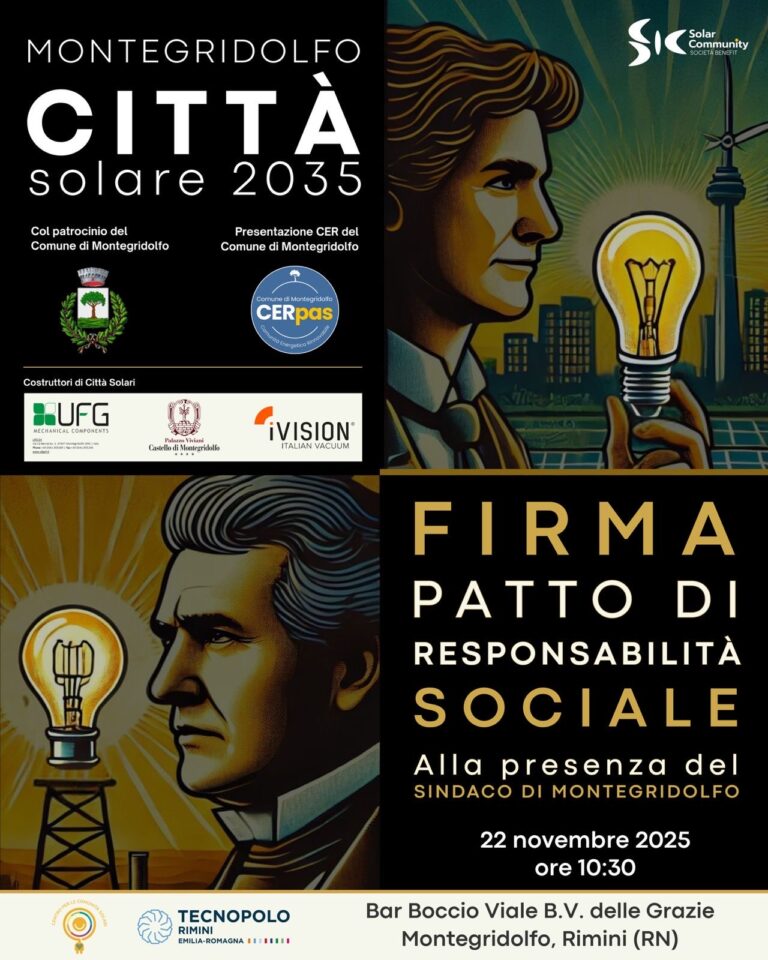 Montegridolfo lancia la sua Comunità Energetica Rinnovabile e la piattaforma dell’Ecosistema di Comunità Solare. Sabato 22 novembre 2025 – Bar Bocciodromo di Trebbio, ore 10:30 Leggi tutto » 20/11/2025