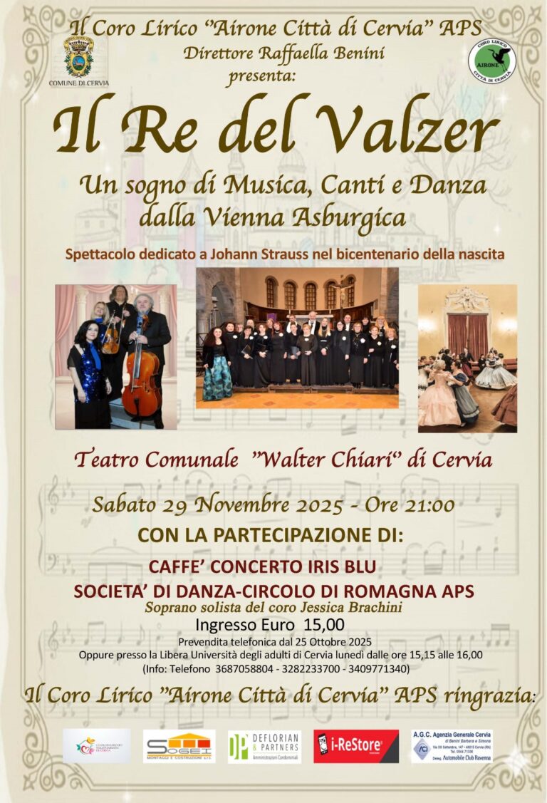Il Coro Lirico “Airone Città di Cervia” presenta: “Il Re del Valzer”. Sabato 29 novembre 2025 alle ore 21:00. Leggi tutto » 17/11/2025