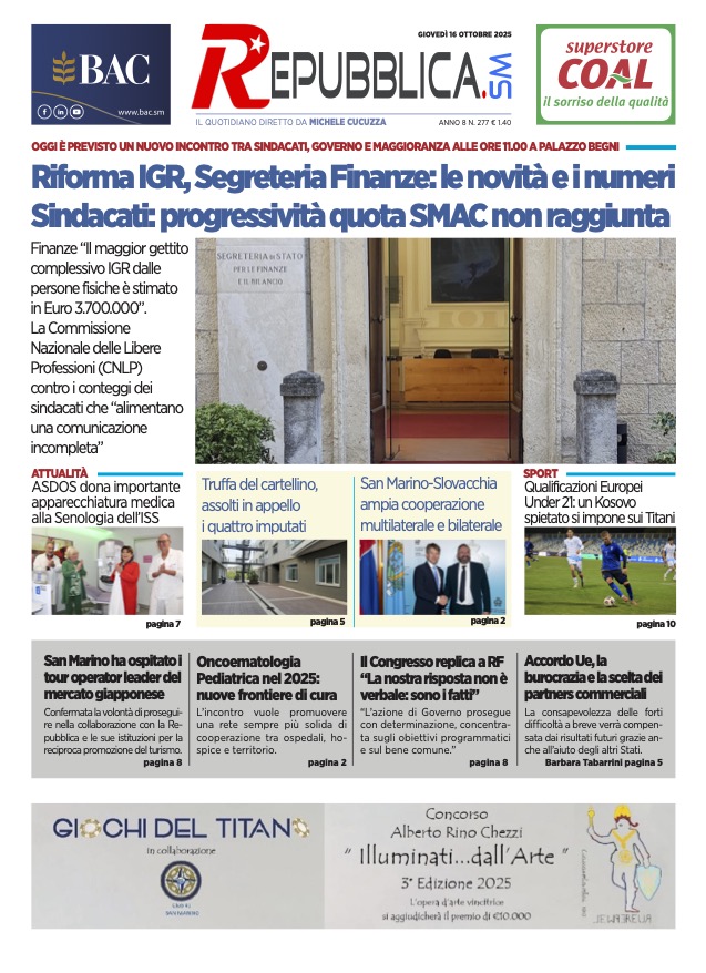 San Marino. Congresso di Stato: il “minestrone” di accuse di Rf non ferma l’azione di Governo, impegnato a costruire il futuro del Paese Leggi tutto » 15/10/2025